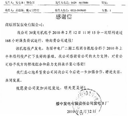 附:綏中發(fā)電B廠發(fā)來(lái)的感謝信